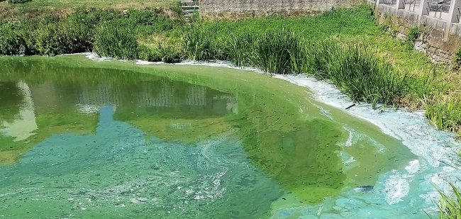 Durch die zu erwartende Trockenwetterphase vermehre sich wegen des erwärmten Wassers eine besondere Algenart die Sauerstoff verbraucht. (s. Foto)