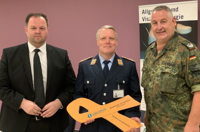 In seiner Begrüßungsrede stellte Dr. Felix Meuschke (Oberfeldarzt der Reserve und Chefarzt der Allgemeinen- und Viszeralchirurgie) heraus, dass es der Asklepios-Klinik eine Herzensangelegenheit ist, die Verbundenheit zu den Streitkräften durch das Annehmen der „Gelben Schleife“ zu zeigen und den Förderverein Stab DSK e.V. bei seiner ehrenamtlichen Tätigkeit zu unterstützen.
